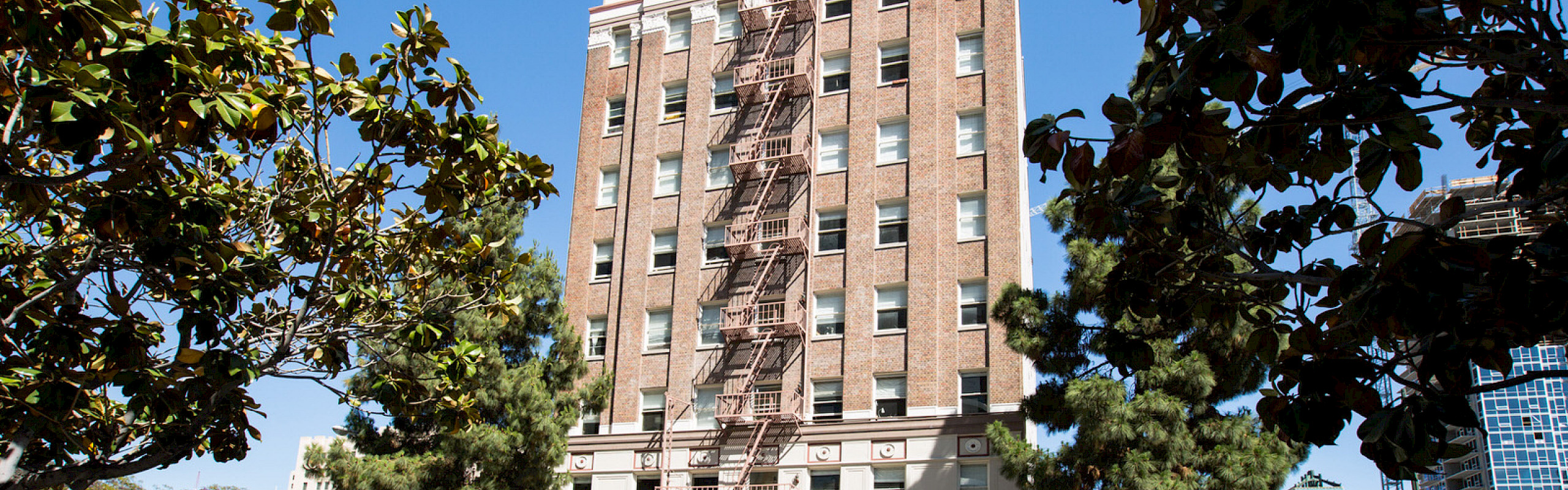 Constructed in 1924, this distinctive eight-story building was one of America’s first parking structures. In the early 1920s, the rapid adoption of the automobile in Los Angeles prompted the city to call for the construction of parking garages. Claud Beelman, a prestigious architect with over ten buildings listed on the National Register of Historic Places, designed an elaborate Beaux-Arts edifice that had continuity with the elegant hotels, office buildings, and stores once gracing Grand Avenue. In 1950, Pacific Telephone & Telegraph Co. purchased the building, converting it into office space and in 2002, Martin Building Co. completed its transformation into 49 upscale lofts.